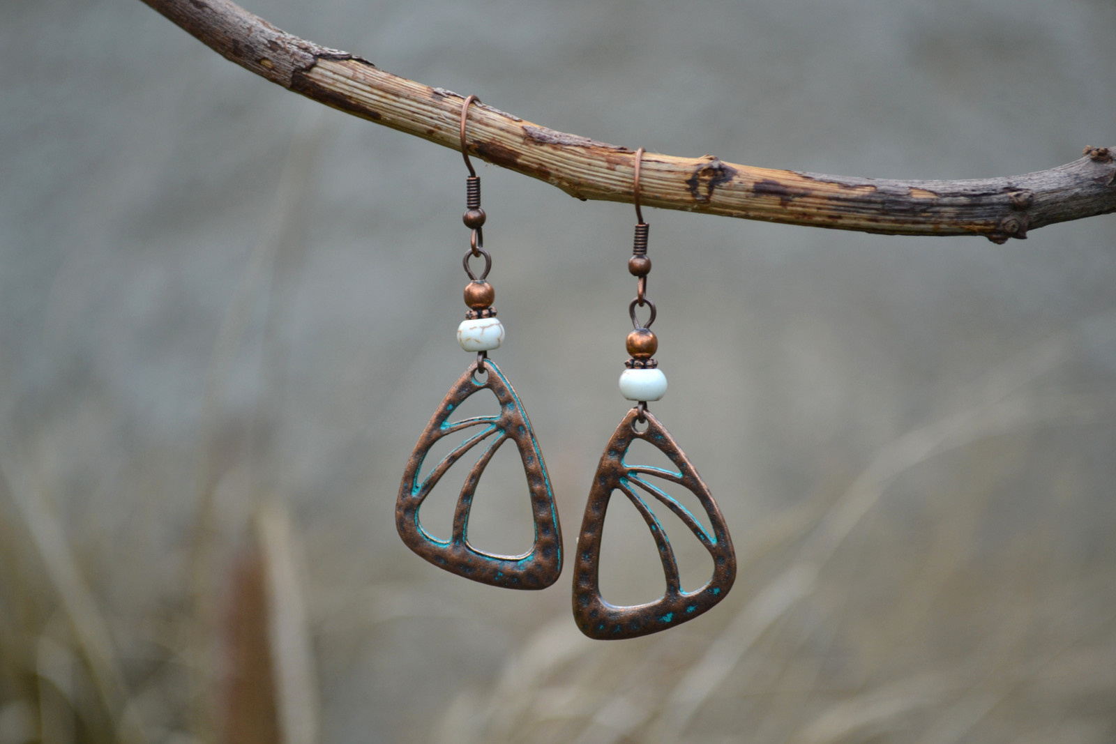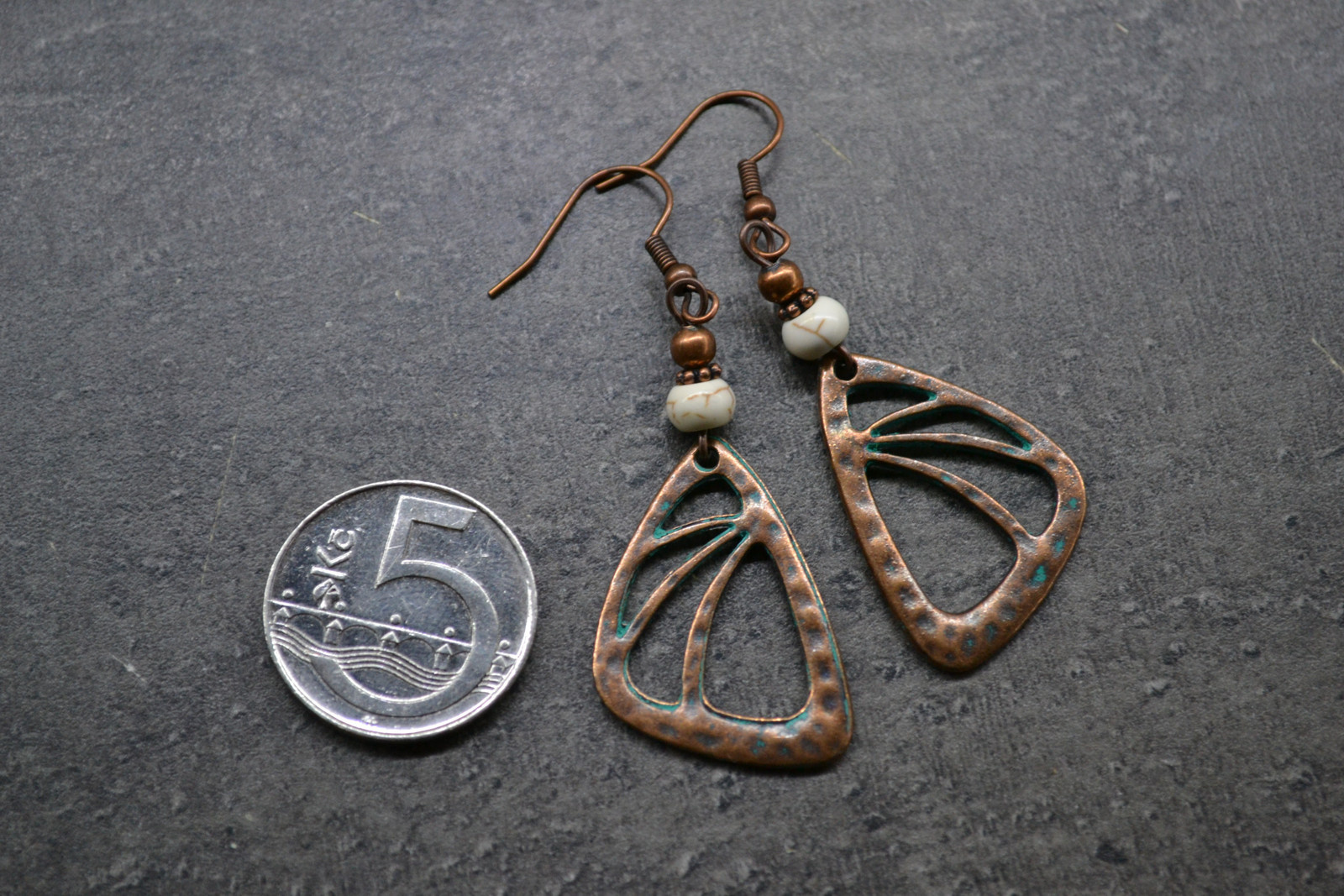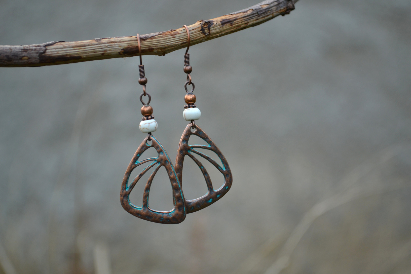 earrings with an interesting pendant in a copper shade, complemented by howlite flakes and metal beads and components