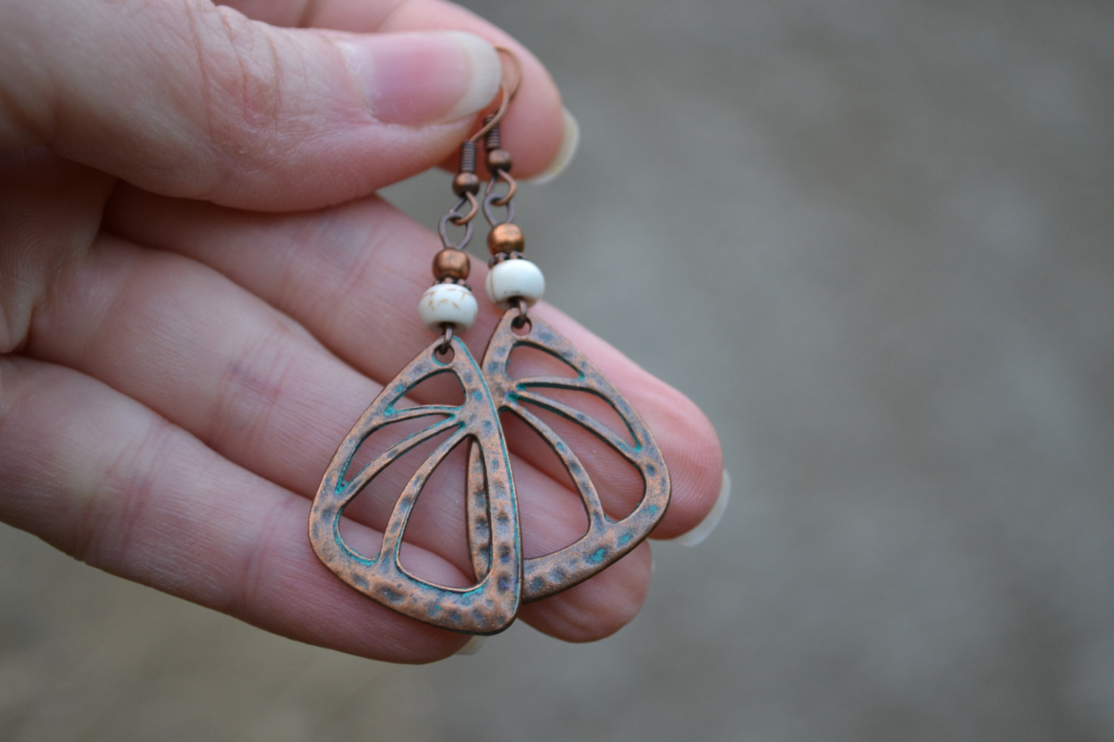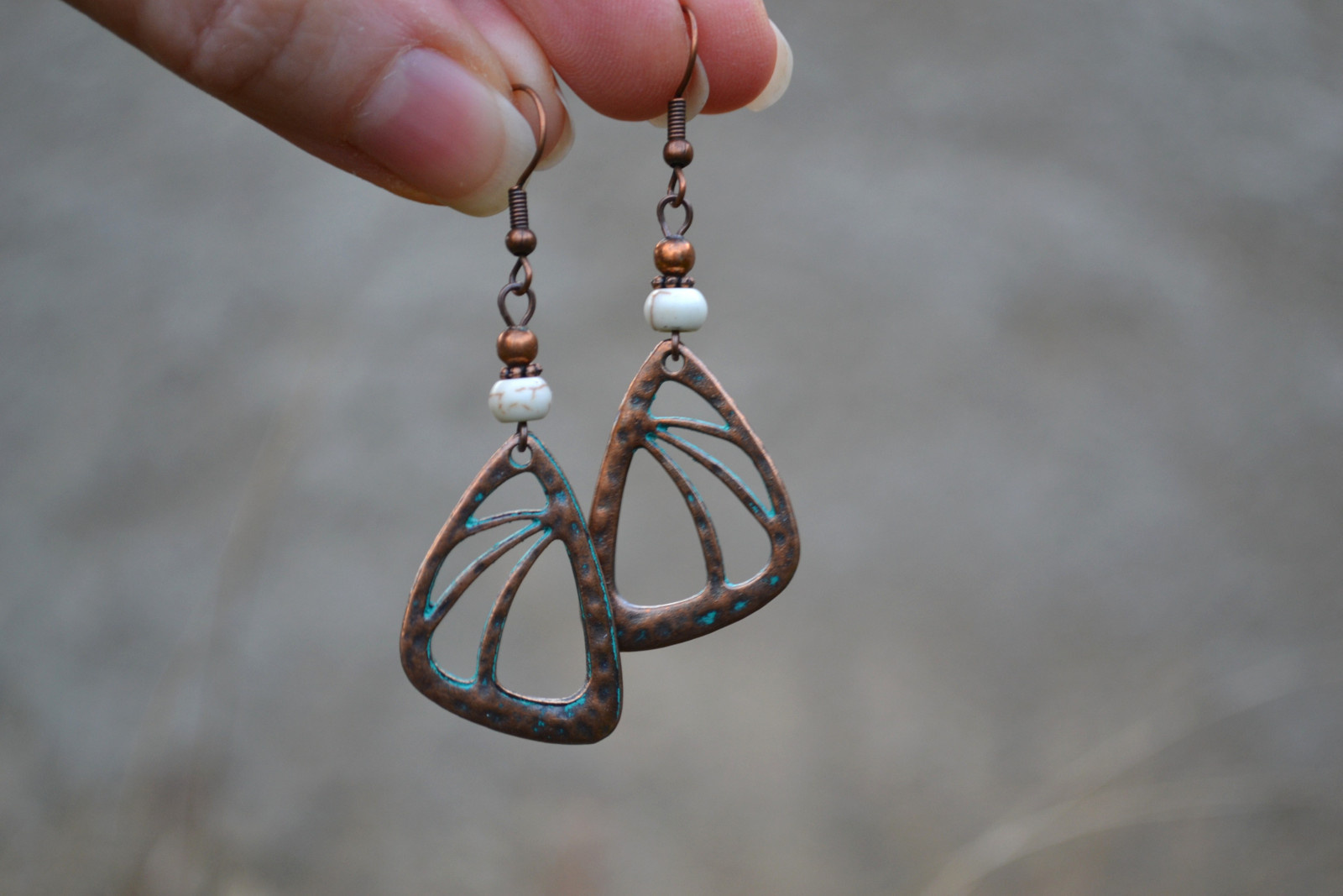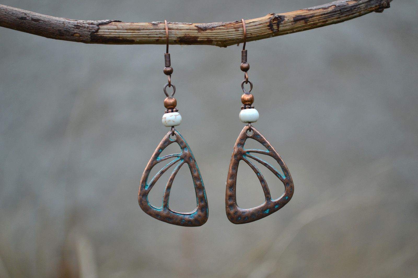 earrings with an interesting pendant in a copper shade, complemented by howlite flakes and metal beads and components