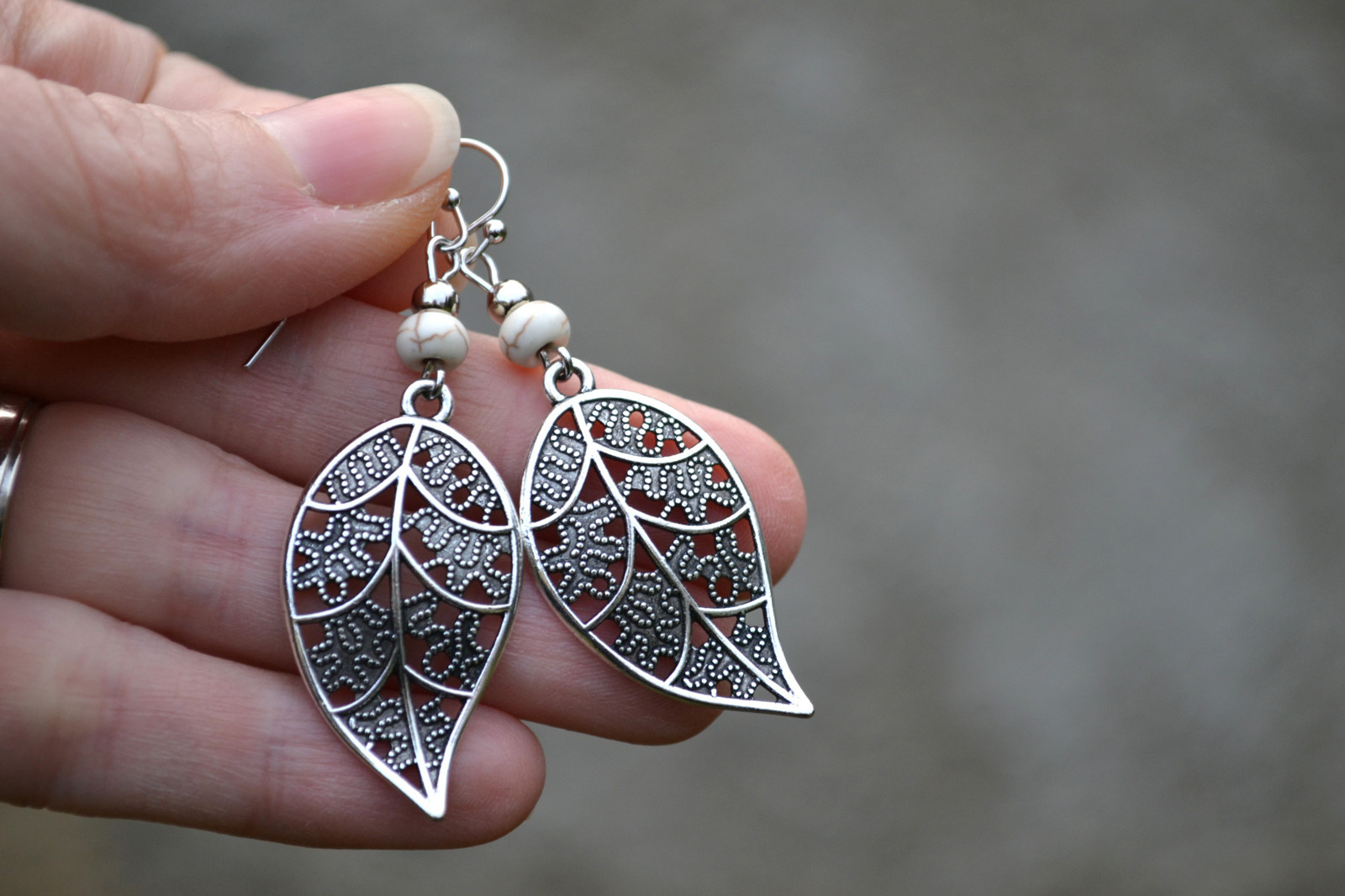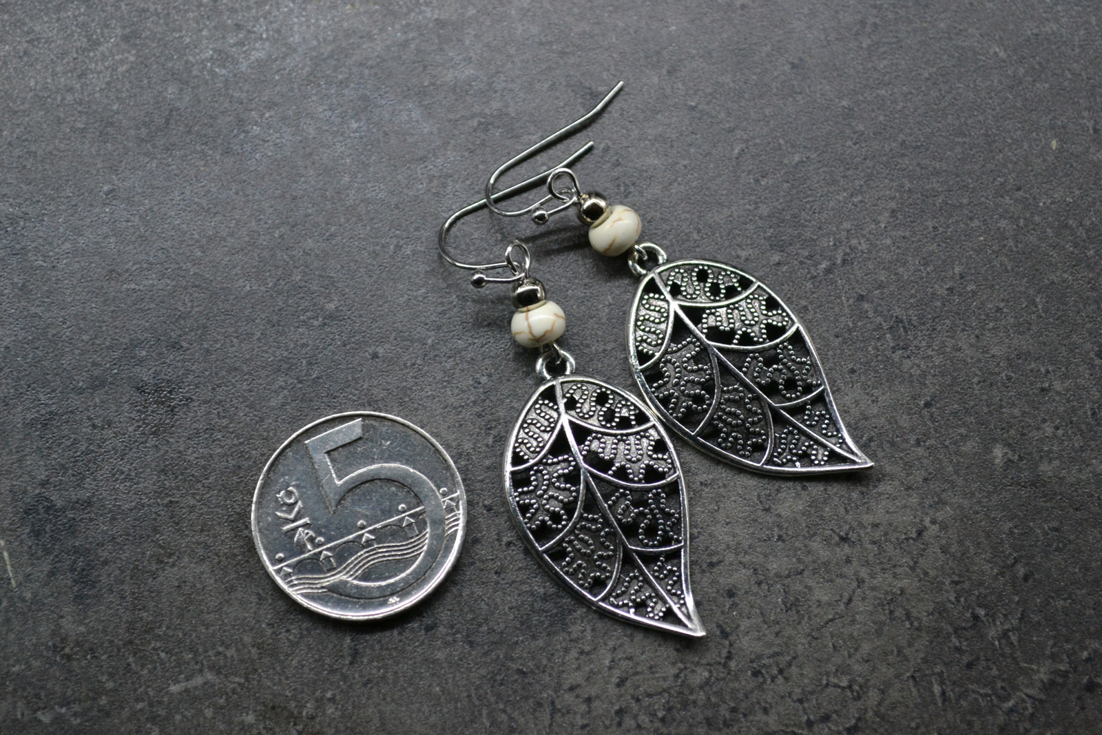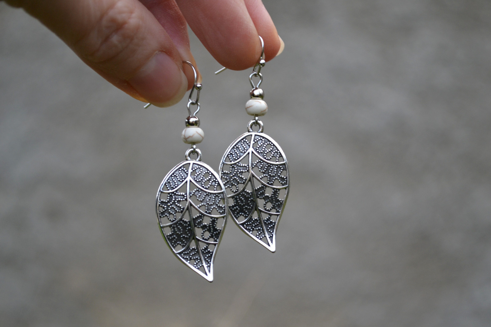 earrings with a leaf-shaped pendant complemented by beads and with howlite