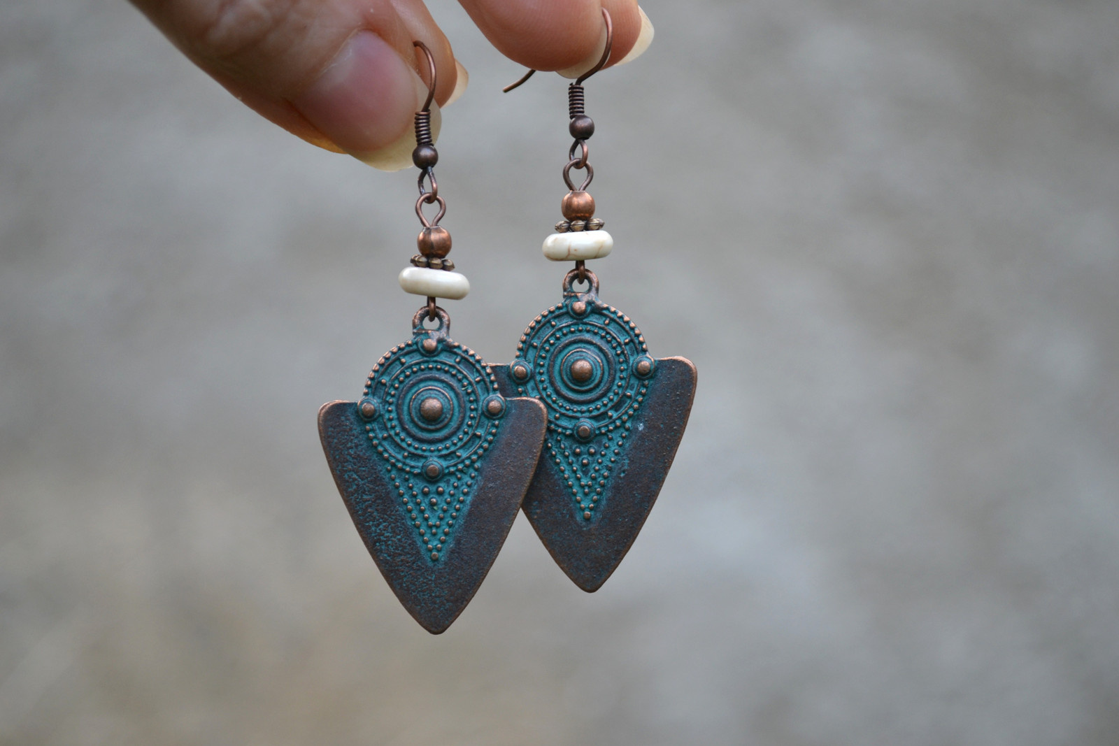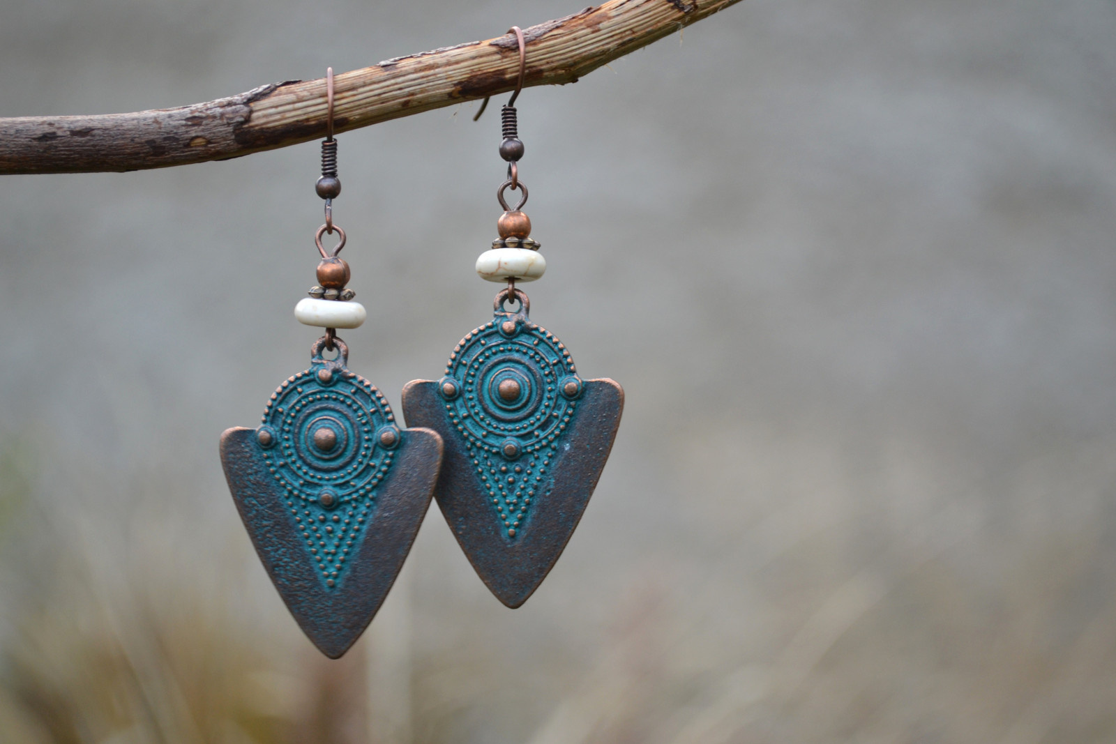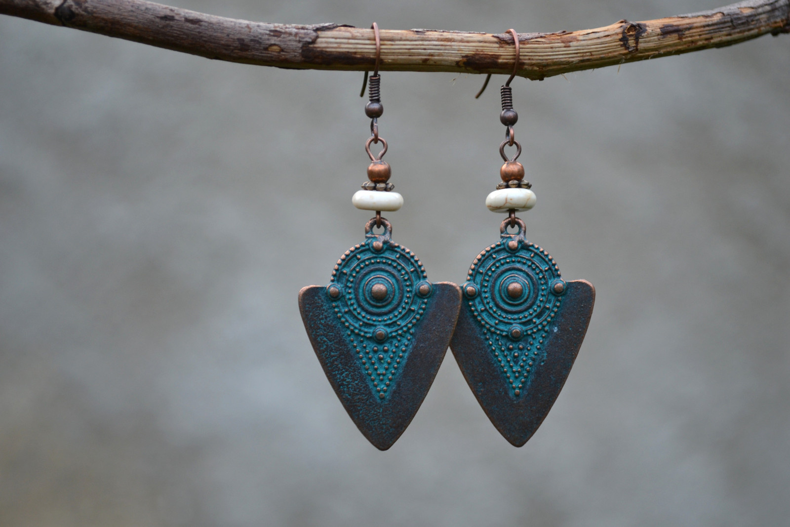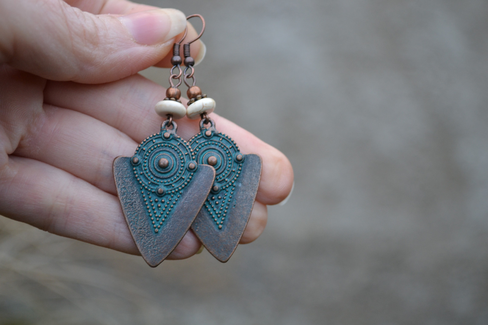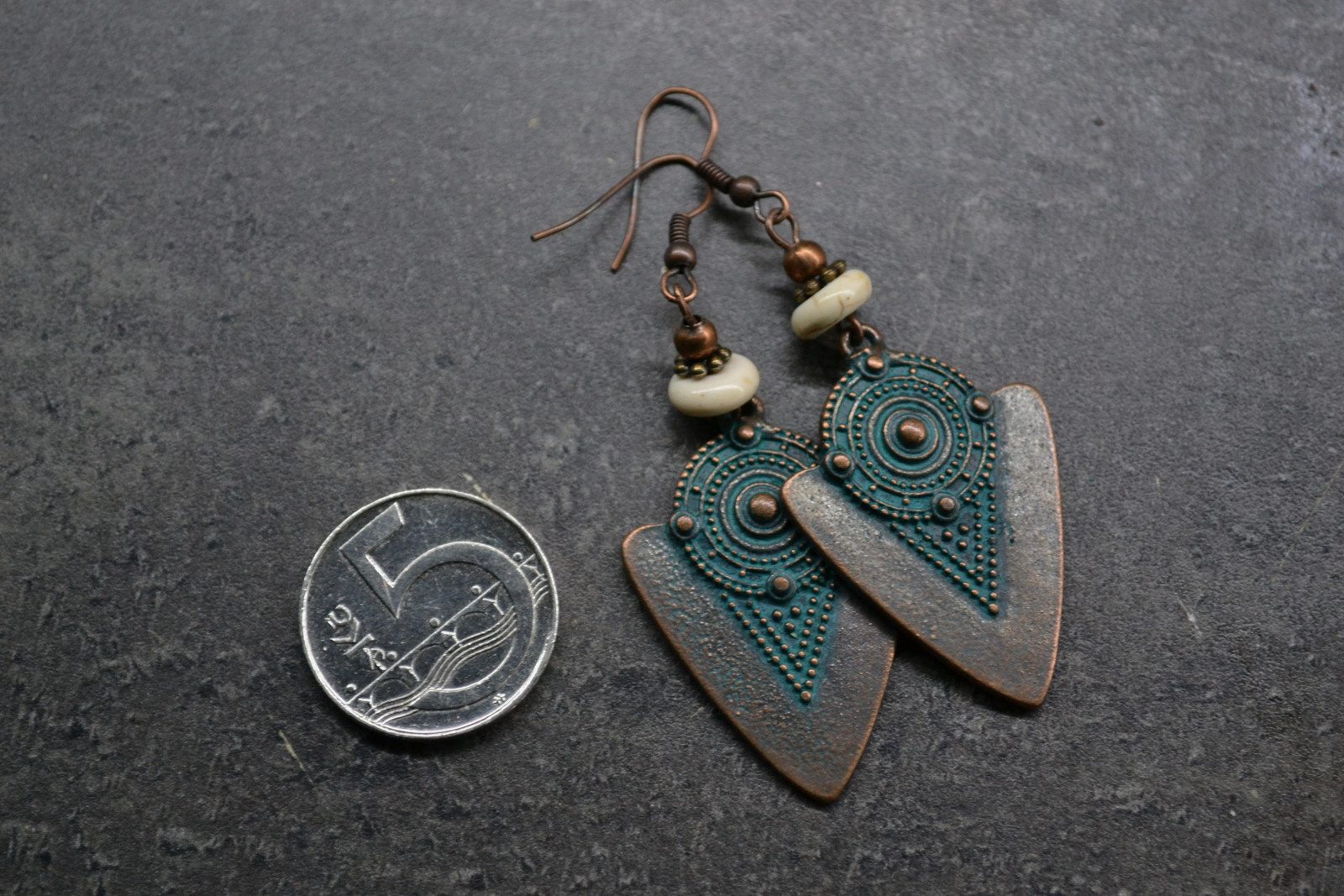 kolczyki z ciekawą etno zawieszką uzupełnioną koralikami i talerzykiem z howlitu