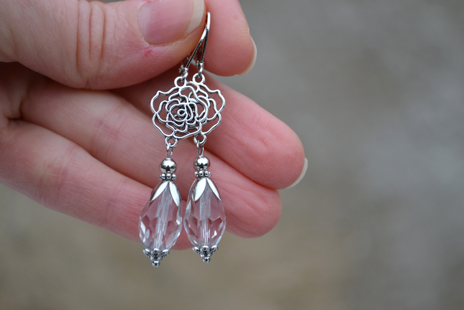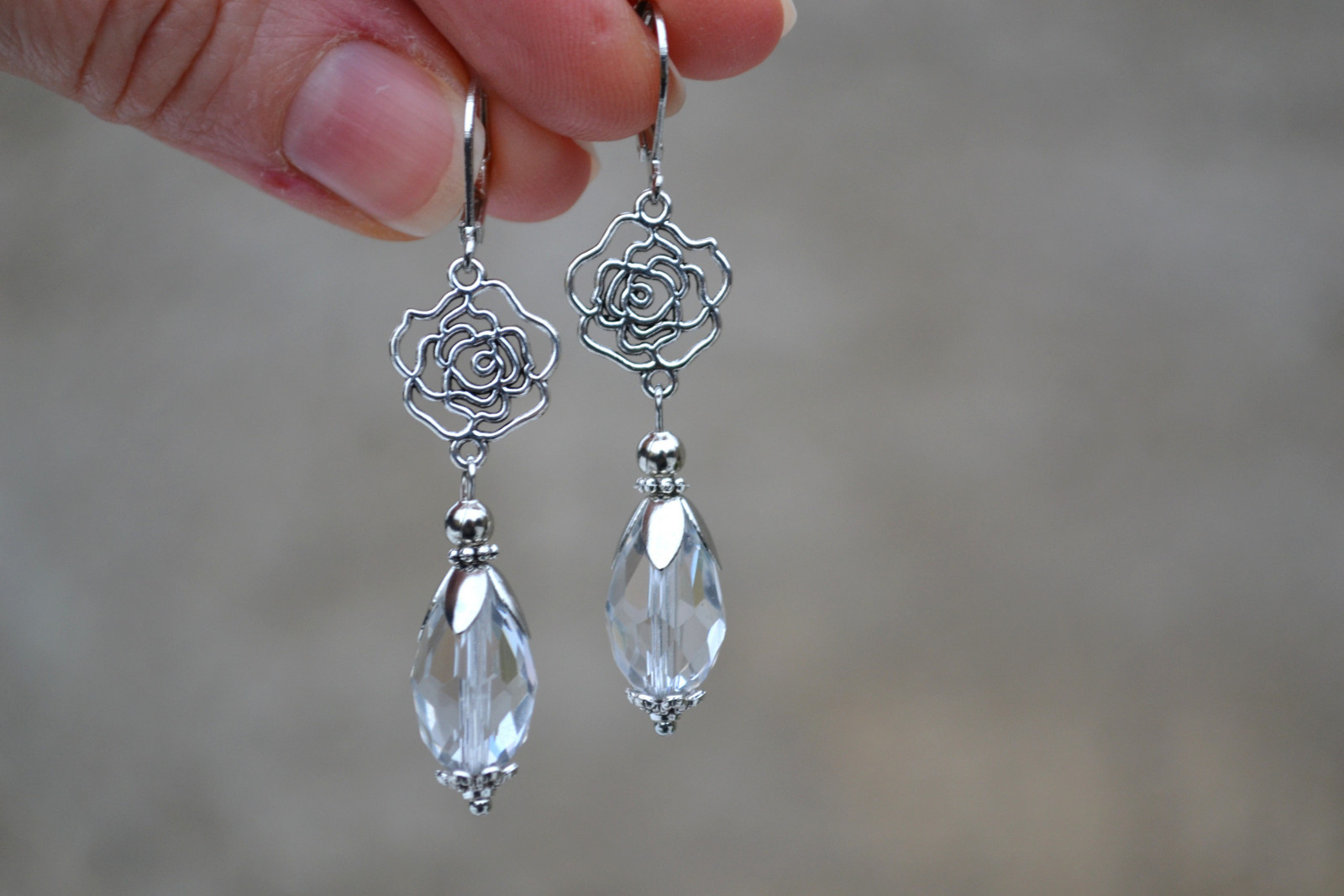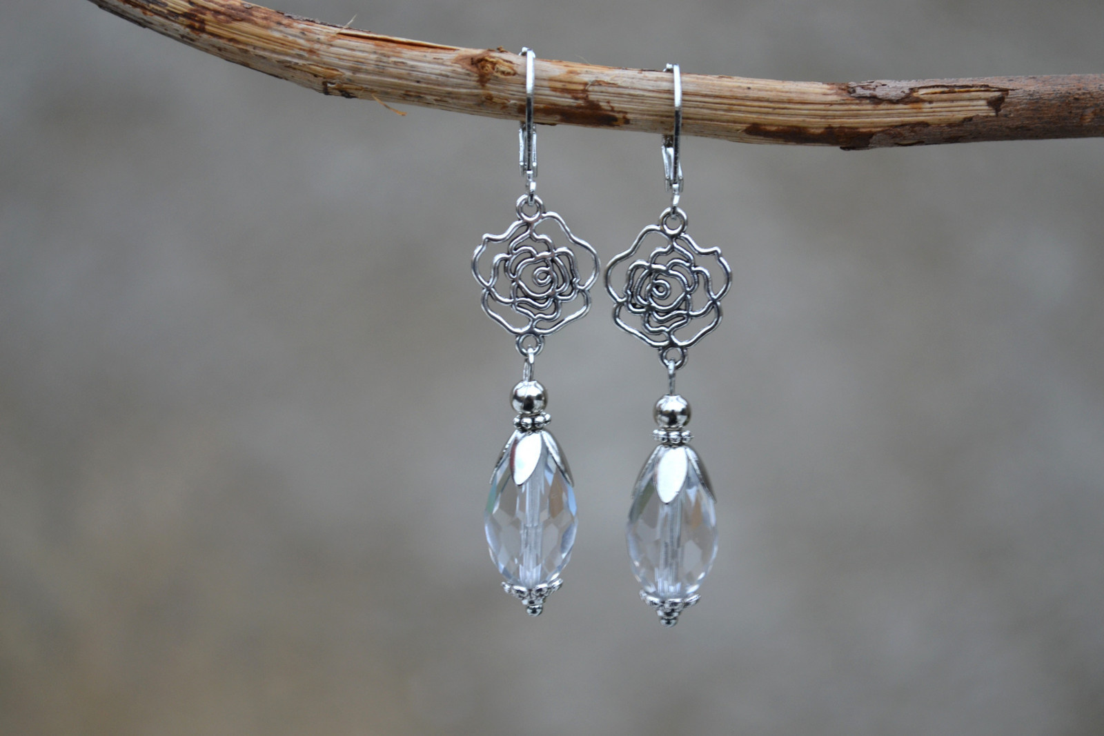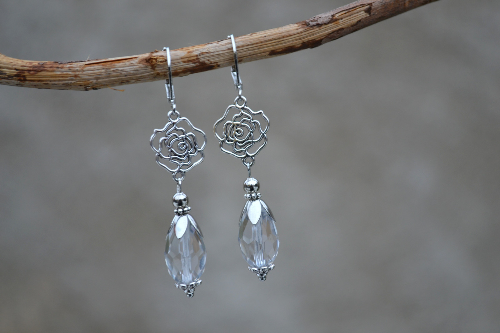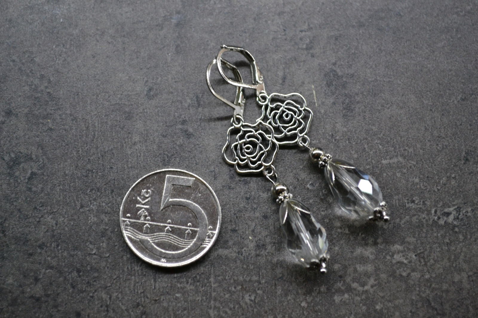 náušnice s krásným, jemným přívěskem v podobě růže doplněn komponenty, korálky, a čirými kapičkami, zaklapávací zavírání