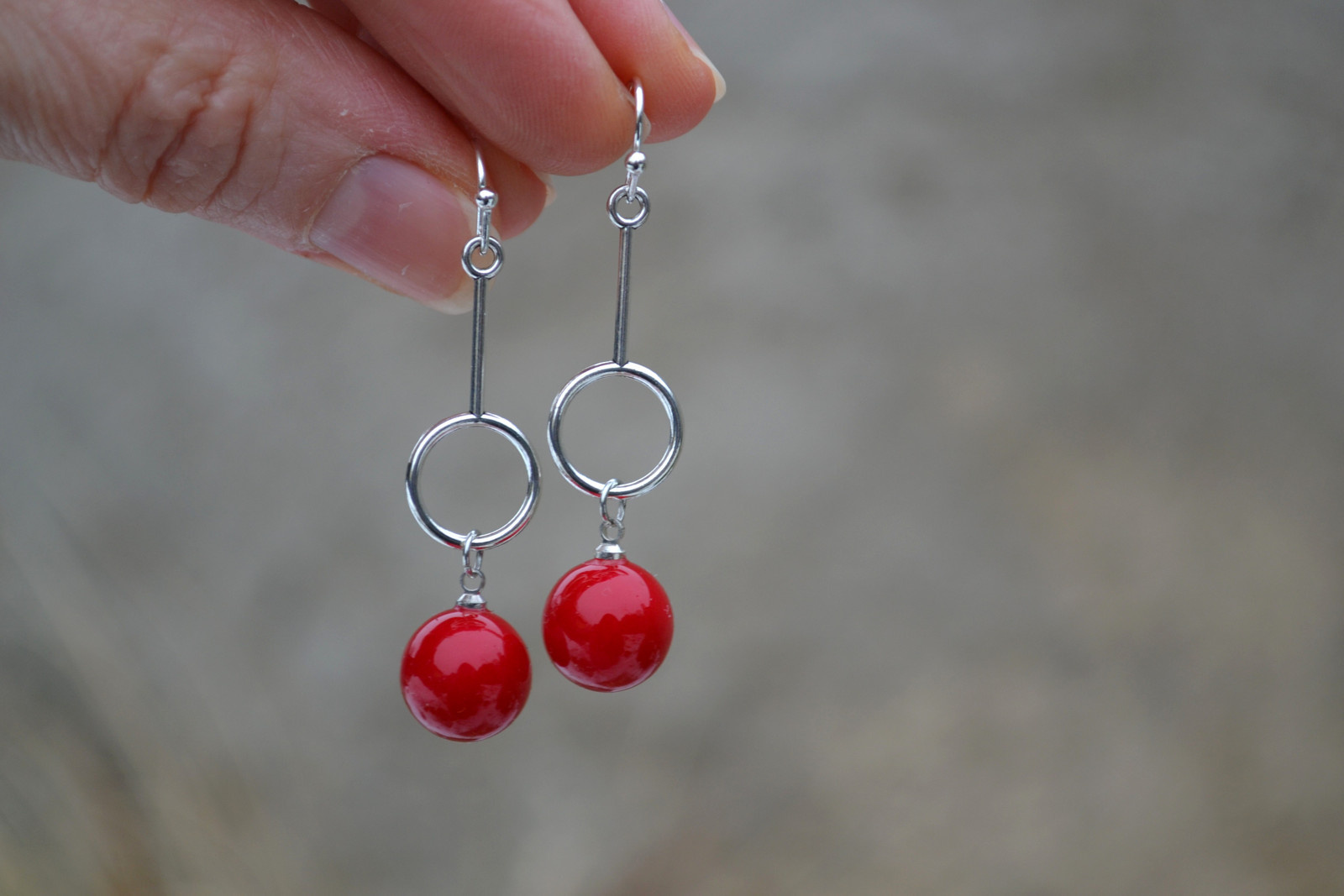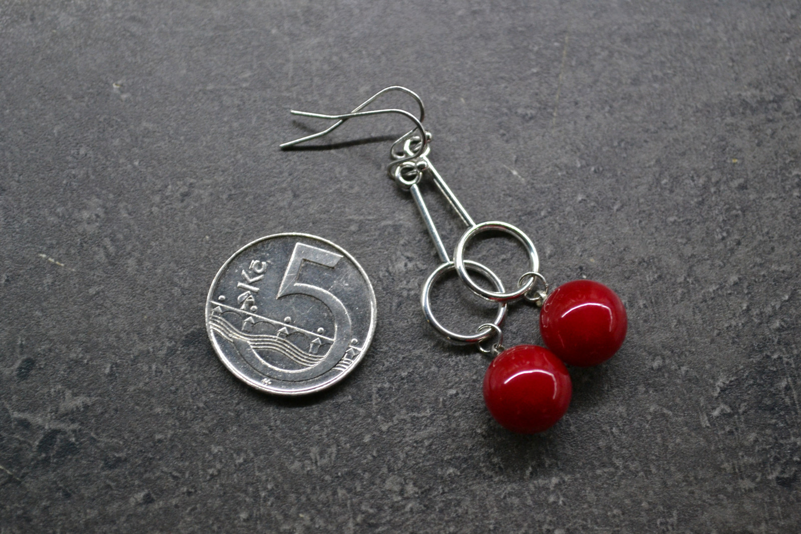náušnnice s červenými kouličkami na kovové tyčince s kroužkem