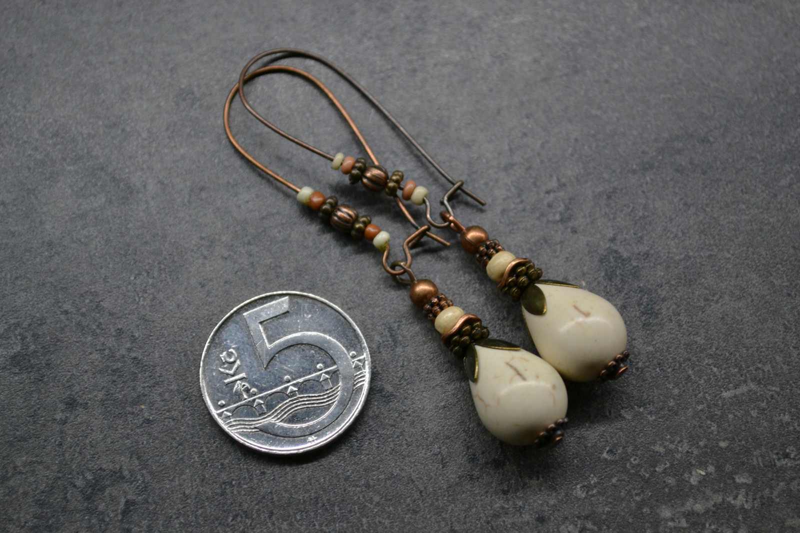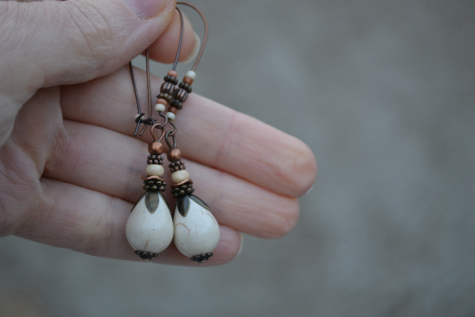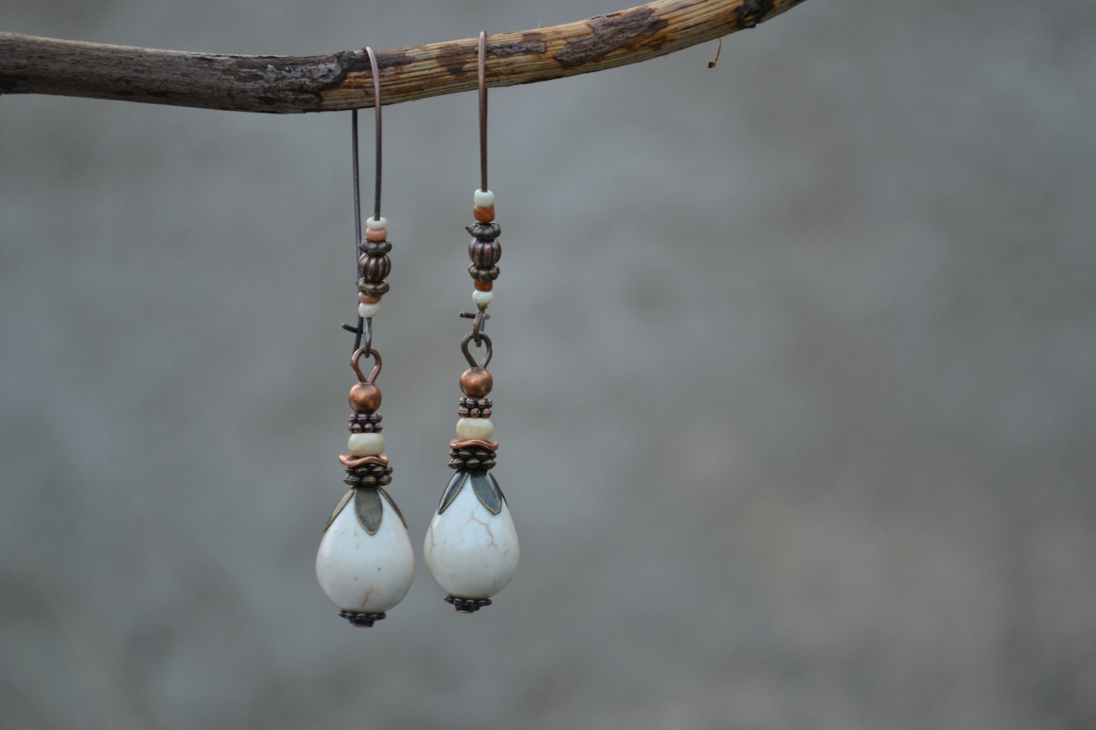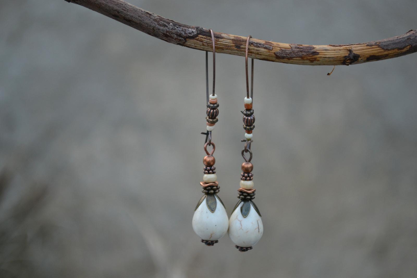 Ohrringe mit einem Howlith-Tropfen, verziert mit Perlen und anderen Elementen, an einem langen, dekorierten Haken