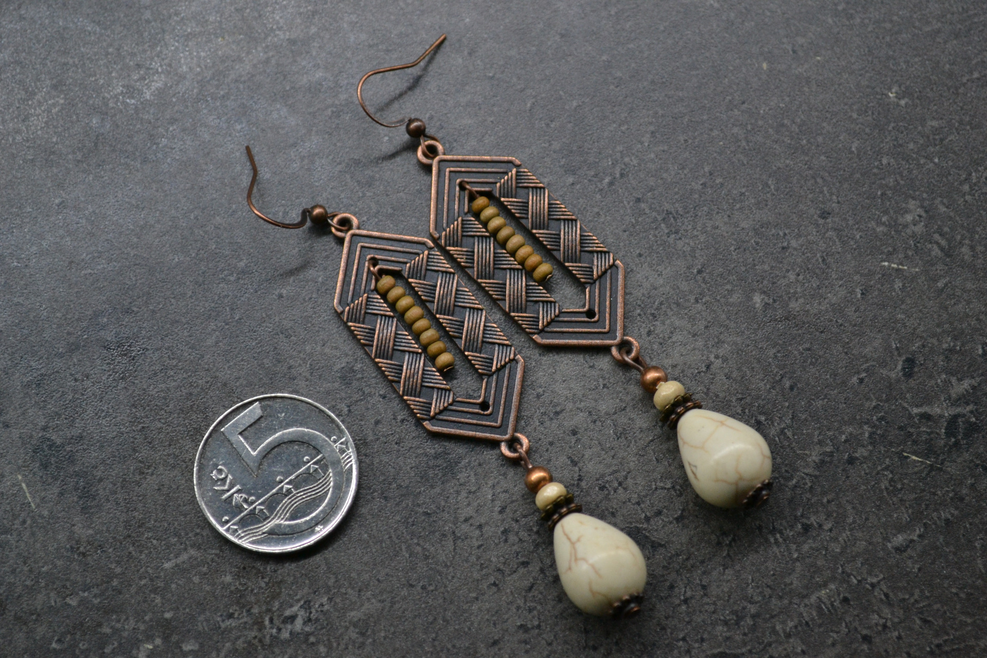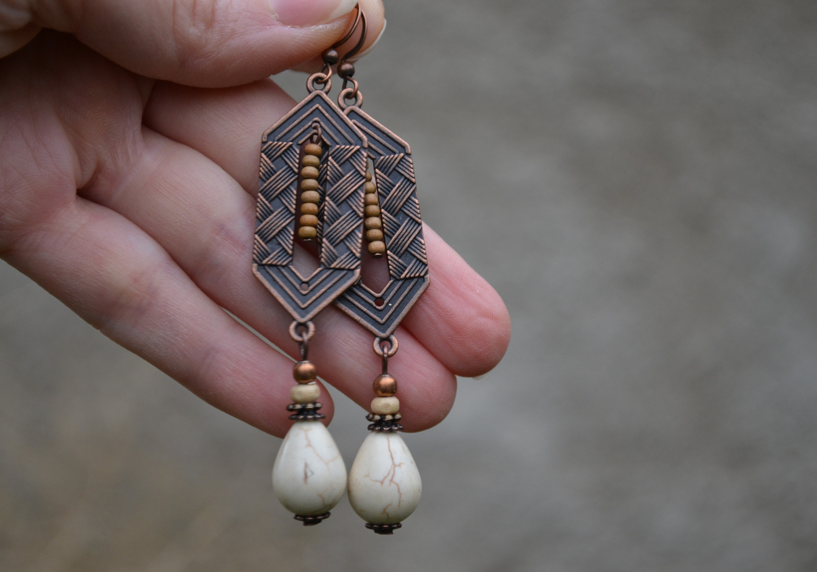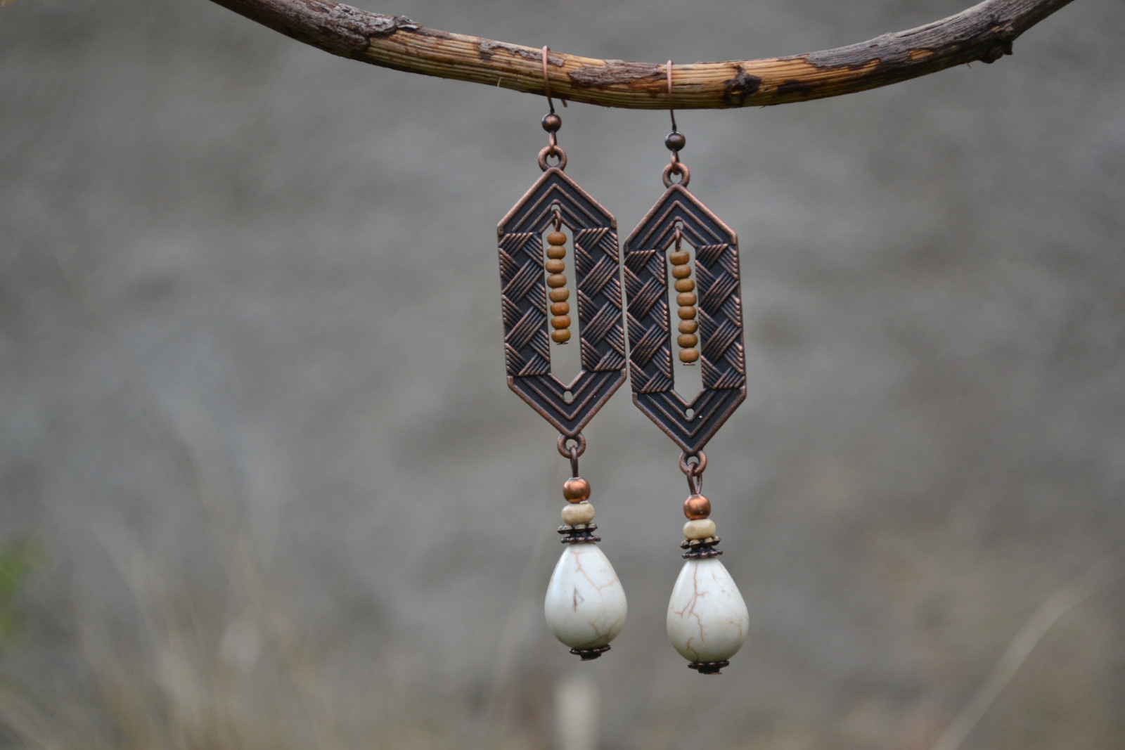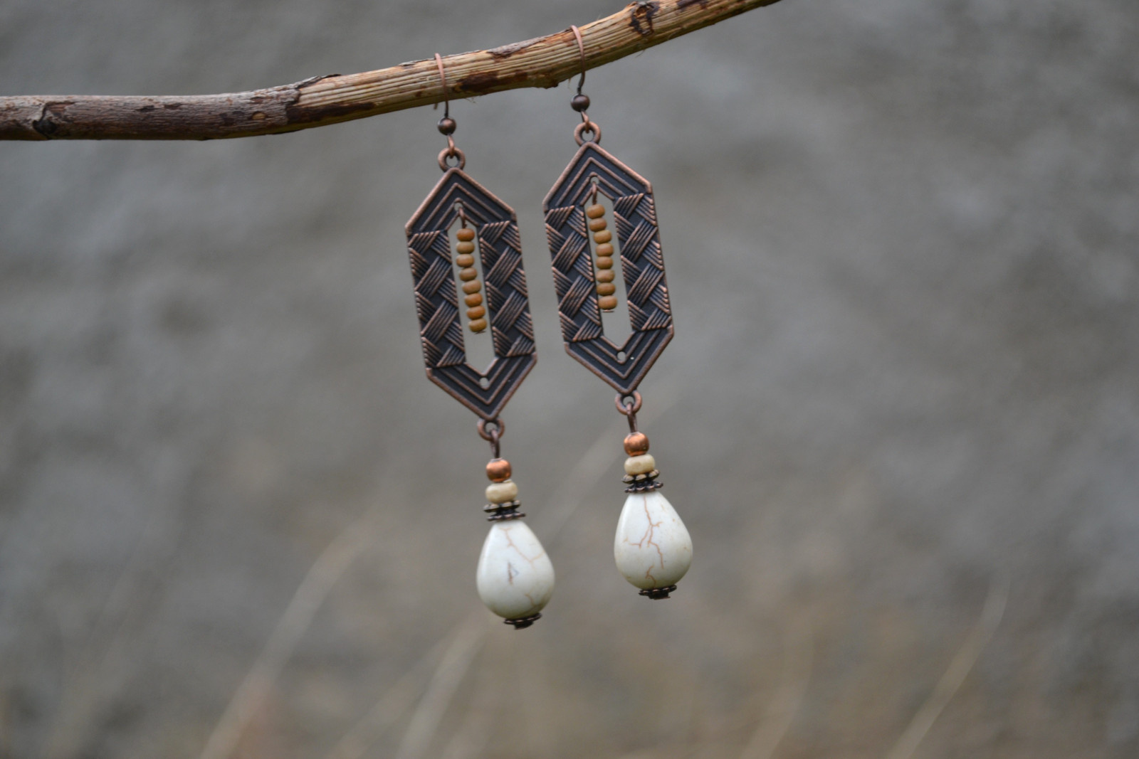 Ohrringe mit interessanten Anhängern, komplett mit einem Tropfen Howlith, Komponenten sowie Holz- und Metallperlen